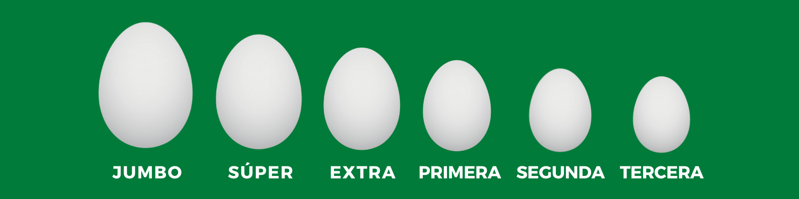 Descubre nuestros 6 tamaños de huevos:JUMBO, SÚPER, EXTRA, PRIMERA, SEGUNDA, Y TERCERA.
